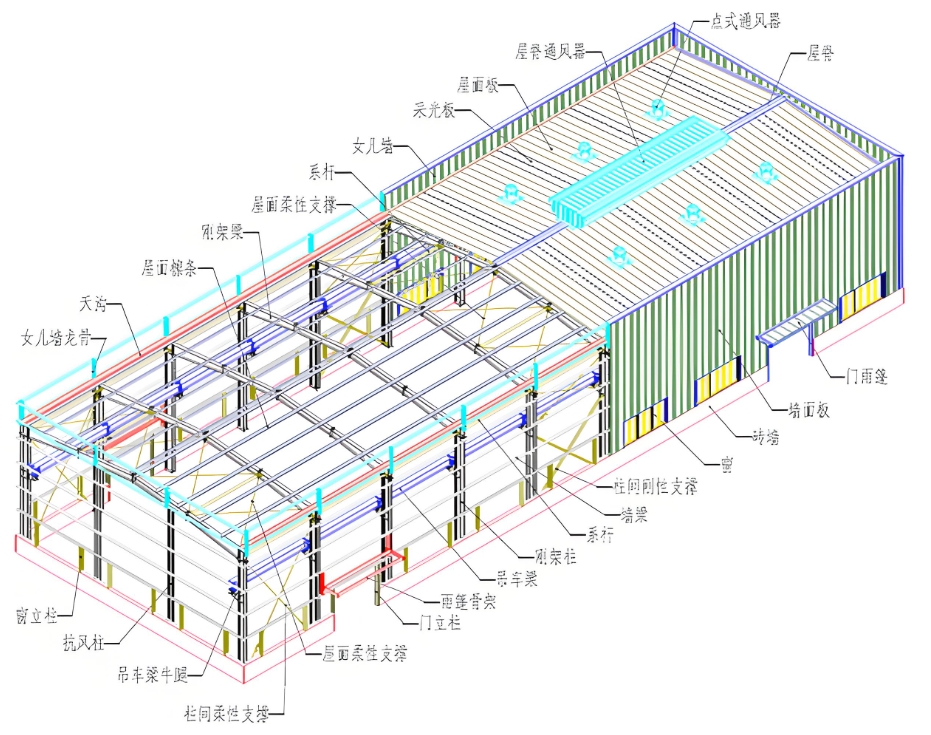 钢结构厂房:目前门式钢架轻钢结构厂房应用较为广泛,造价低,施工快